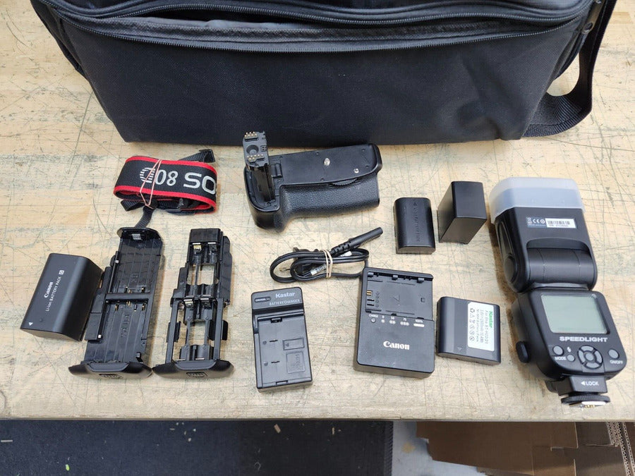The Canon EOS 80D comes with Canon Zoom Lens 18-55mm & 55-250mm and accessories, all in good condition. This product has been tested and all functions are fully working, ensuring a seamless photography experience. It shows minor signs of wear from use, including marks and scratches, but these do not affect its performance. The package includes only what is pictured.