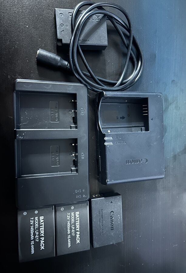 Comes with original battery and charger, plus 2 aftermarket batteries and charger, and a wall power adapter to run the camera battery free.